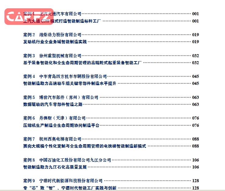 案例 1 上汽大通汽车有限公司········································································· 001 上汽大通 C2B 模式打造智能制造标杆工厂 ··························································· 001 案例 2 潍柴动力股份有限公司········································································· 019 发动机行业全业务域智能制造实践 ····································································· 019 案例 3 徐州重型机械有限公司········································································· 032 基于装备智能化和全生命周期管理的高端轮式起重装备智能工厂 ································ 032 案例 4 中车青岛四方机车车辆股份有限公司 ························································ 045 智能制造助力高速动车组关键零部件制造水平提升 ················································· 045 案例 5 博世汽车部件(苏州)有限公司 ····························································· 063 数据驱动的汽车零部件智造之路 ········································································ 063 案例 6 丹佛斯(天津)有限公司 ······································································ 076 压缩机生产制造全生命周期协同制造平台····························································· 076 案例 7 杭州西奥电梯有限公司········································································· 088 面向大规模个性化定制与全生命周期管理的电扶梯智能制造新模式 ····························· 088 案例 8 中国石油化工股份有限公司九江分公司 ····················································· 106 智能制造助力九江石化高质量发展 ····································································· 106 案例 9 宁德时代新能源科技股份有限公司 ·························································· 128 专“芯”致“智”,宁德时代智能工厂实践与创新 ················································· 128 “智能制造发展探索”系列丛书 —— 智能工厂(一)