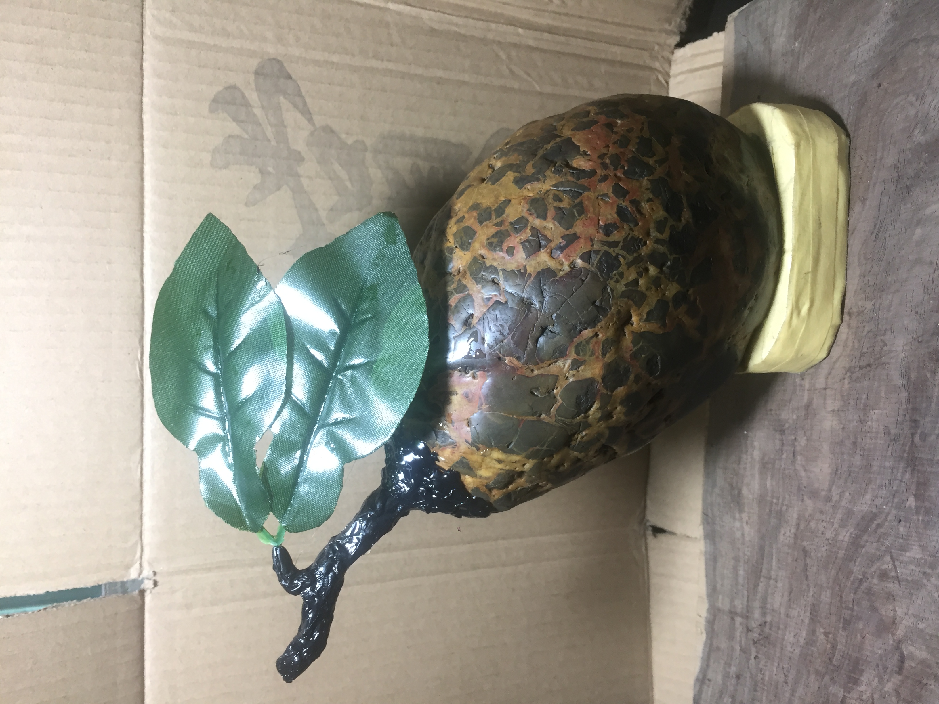 今晚无聊又翻箱底的石头出来看,竟发现这块壮锦石一下子就觉得像个瓜果,然后用棒胶做了一条藤蒂再加上两张叶子。